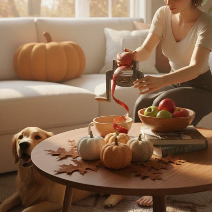 Sometimes I even leave the peel curled on the cutting board for a minute because it smells sweet and crisp, and the scent mixes with the soft fall air coming in around the edges of the windows, and it feels like my living room is doing exactly what I need it to do, which is hold me gently.