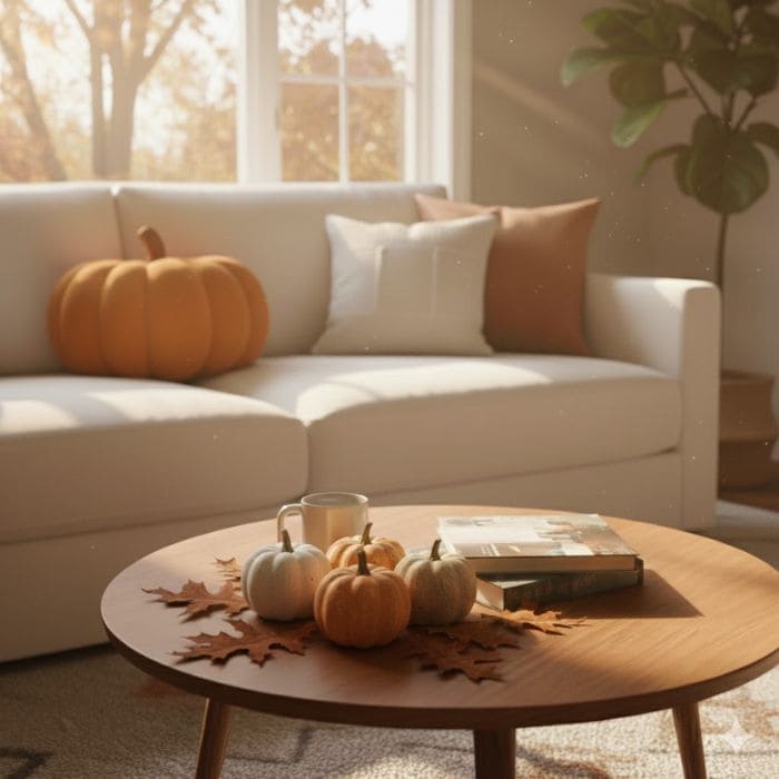 Also, add a few mini pumpkins or a simple bowl of seasonal fruit on the coffee table, because real-life seasonal objects make a bigger difference than overly themed decor.