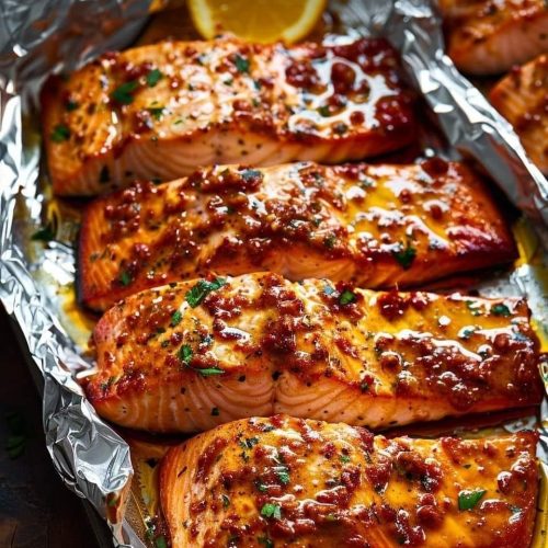 • Spoon or brush the honey garlic sauce over the salmon fillets, making sure the surface is evenly coated.