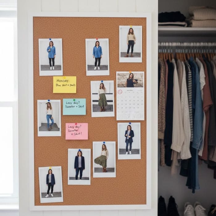 It is a small visual guide that lives where you get dressed. That’s it. Mine is a corkboard inside the closet, and on it I keep a handful of outfit ideas that work with clothes I already own.