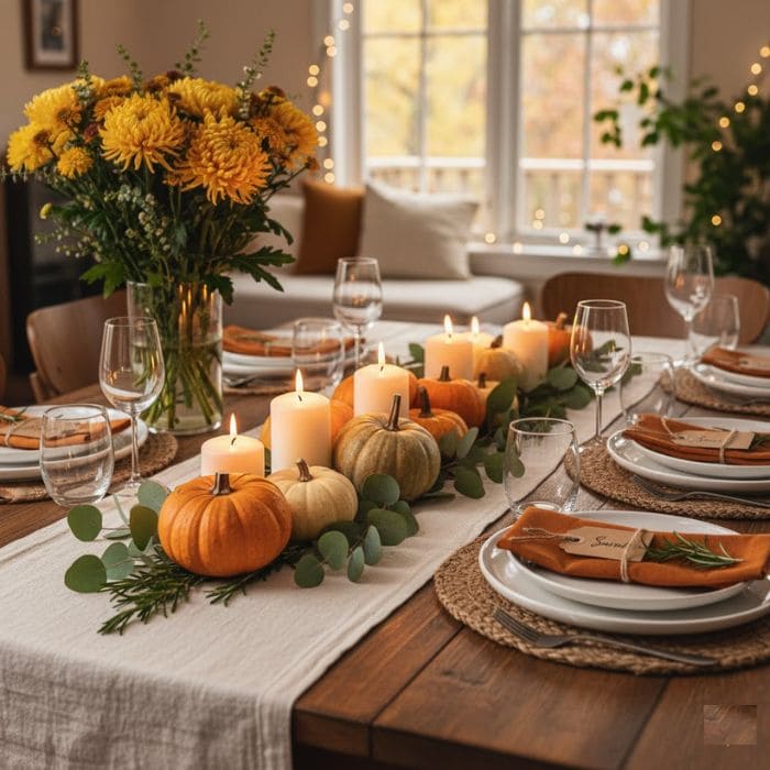I add napkins in one warm tone, and I tie them with twine or ribbon, and if I feel like being extra, I tuck in a rosemary sprig or write names on small tags. It is simple, and it makes guests feel cared for.