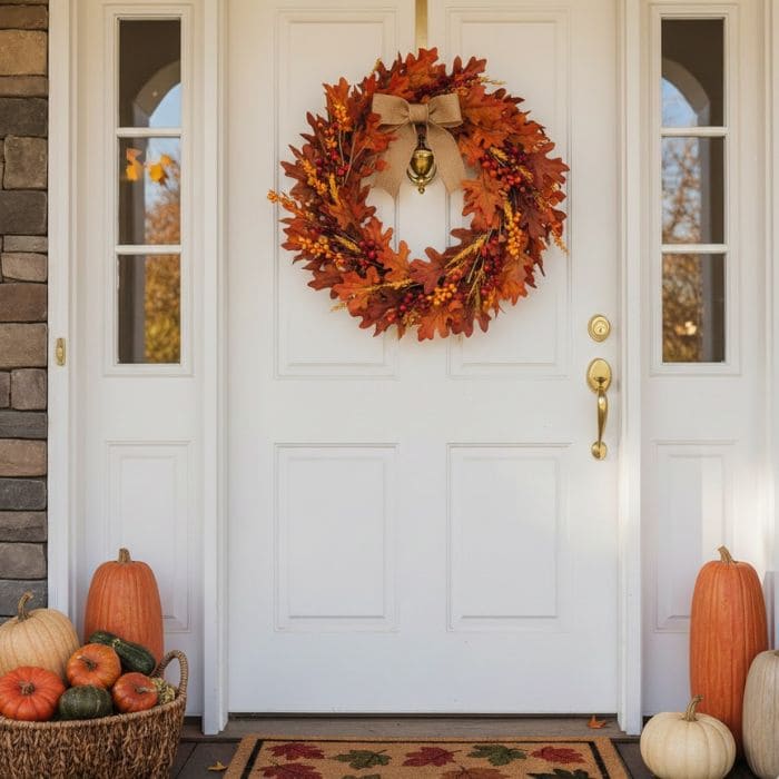 If my wreath looks tired, I refresh it instead of buying a new one by tucking in a few stems I already own, like warm-toned eucalyptus, little berry sprigs, or a ribbon in a deep rust or golden brown. It takes five minutes and it looks intentional, which is my favorite kind of decorating.