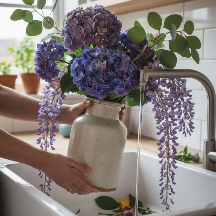 I trim the ends at an angle before putting them in water, because it helps water uptake. I use a tall vase with enough water to support the branches, and I change the water every few days to keep it fresh.