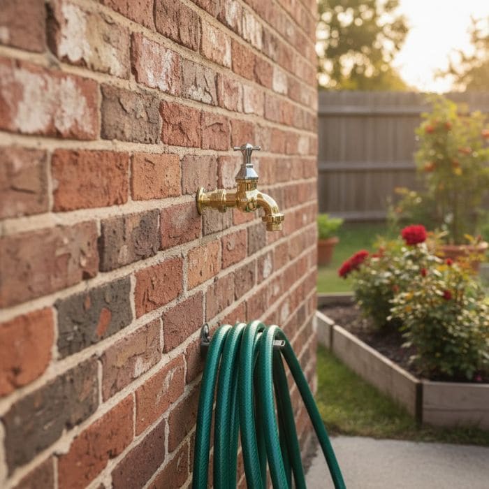 I placed it at a height that feels practical for watering and connecting a hose without bending awkwardly, and I made sure it was positioned so the hose line would not rub against the wall edge or scrape the corner when I move around beds.