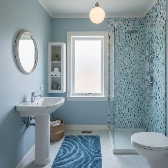 If you were styling this blue bathroom with a simple white sink and an empty base area, which direction would you go?