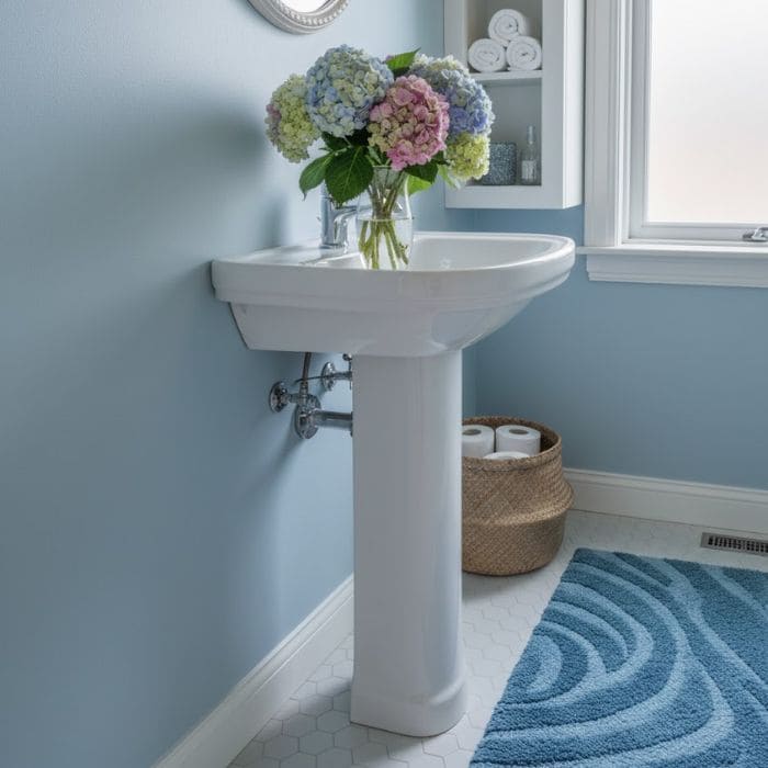 The idea is simple: I’ll place a vase of hydrangeas near the sink, using colors that tie into the bathroom’s blue palette, then add just enough softness so the corner feels alive.