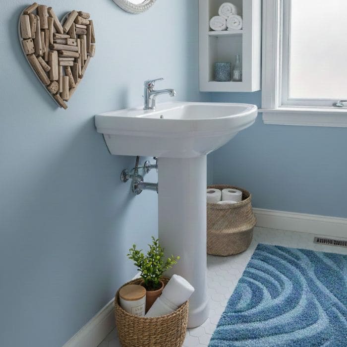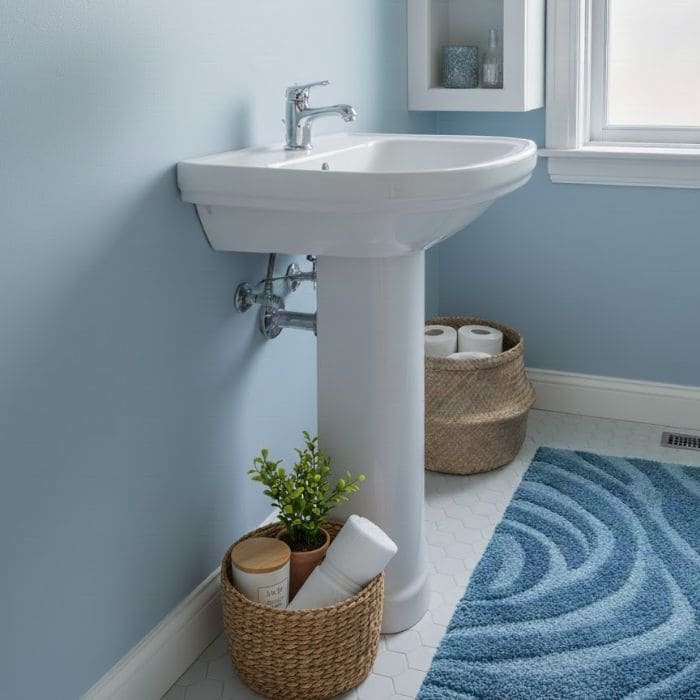 This bathroom has a simple white sink, and the area around the base is visually empty. There is nothing dramatic about it, which is part of the problem.